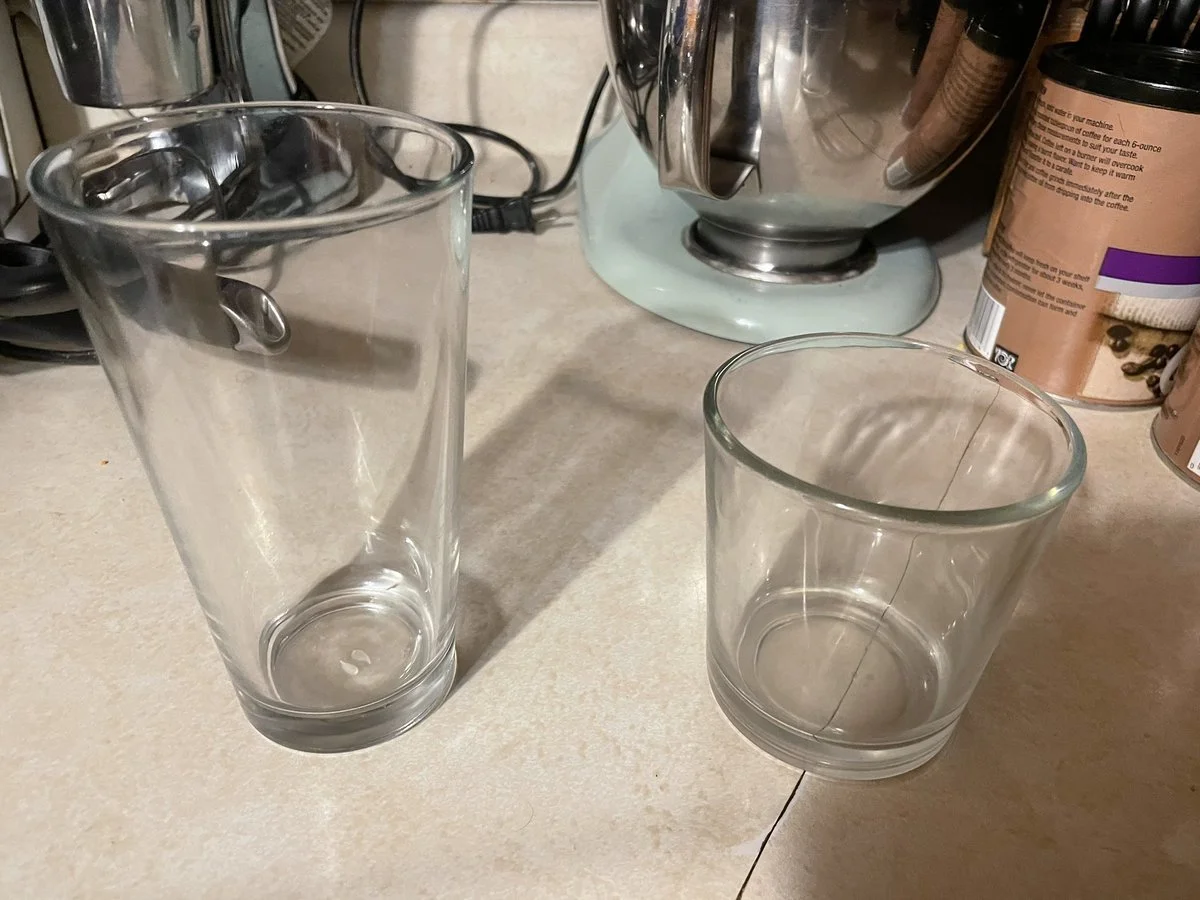 Consider the pinned image. About how much liquid can the shorter cup hold compared to the taller cup?